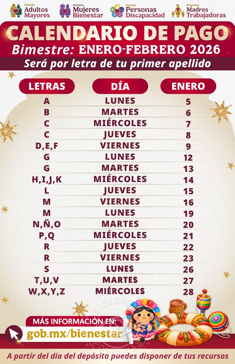 Del 5 al 28 de enero se realiza el pago correspondiente al bimestre enero-febrero de las Pensiones y Programas de Bienestar, informó la secretaria de Bienestar, Ariadna Montiel Reyes, durante la conferencia matutina “Las mañaneras del pueblo”, encabezada por la presidenta Claudia Sheinbaum Pardo. El depósito bancario se efectúa de manera escalonada, conforme a la letra inicial del primer apellido de las personas beneficiarias, con el propósito de brindar una atención ordenada y oportuna.