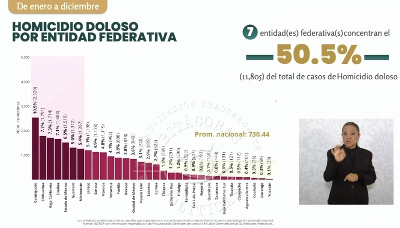 De acuerdo con la información expuesta, siete estados concentran el 50.5 por ciento de los homicidios dolosos en México: Guanajuato (10.9%), Chihuahua (7.7%), Baja California (7.3%), Sinaloa (7.1%), Estado de México (6.5%), Guerrero (5.6%) y Michoacán (5.4%). Veracruz, aunque fuera de este bloque, se mantiene dentro del grupo de las diez entidades con mayor incidencia.