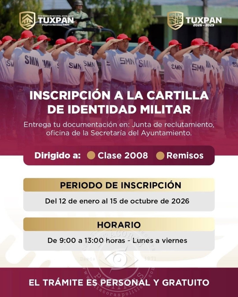 Del 12 de enero al 15 de octubre de 2026 se llevará a cabo en Tuxpan el proceso de inscripción para la Cartilla de Identidad Militar, dirigido a jóvenes de la Clase 2008 y remisos, informó el Ayuntamiento a través de la Junta de Reclutamiento. El trámite es gratuito y busca garantizar el cumplimiento oportuno de esta obligación cívica.