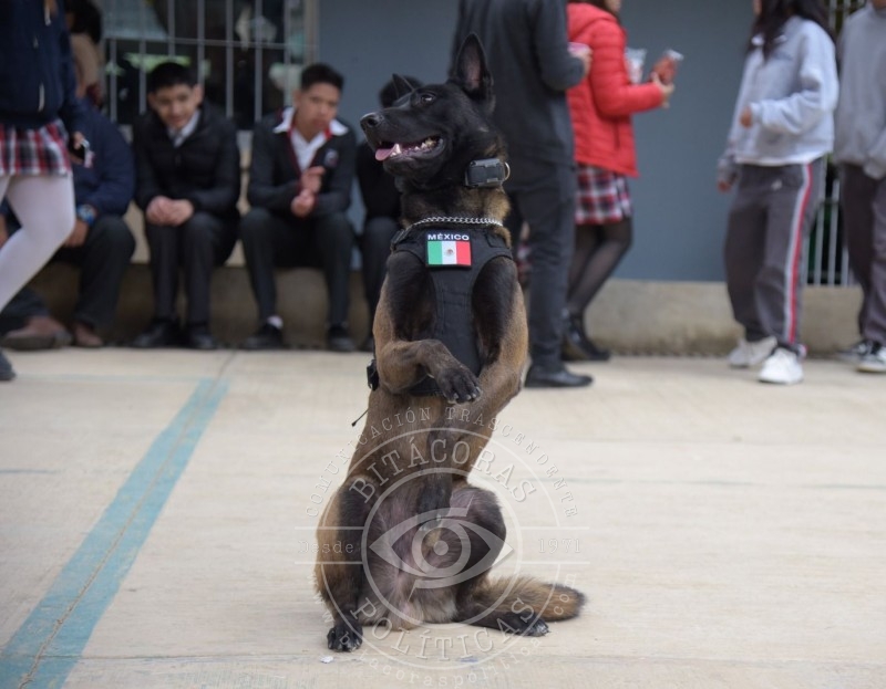 Como parte del programa, se contó con la participación de un elemento canino y un oficial adscrito a la Brigada Animal de la Policía Municipal, quien explicó a las y los estudiantes el manejo, control básico y avanzado del binomio, así como sus habilidades de obediencia, socialización y trabajo en entornos escolares.