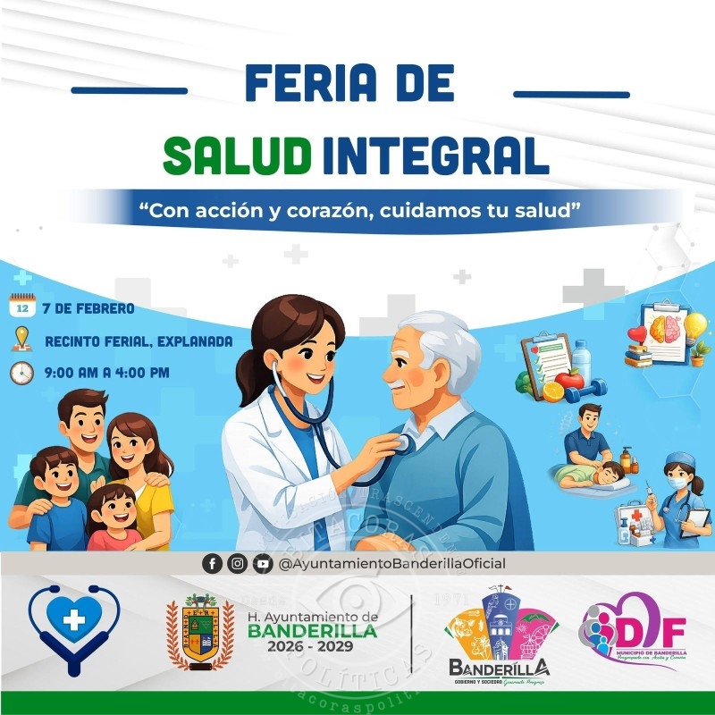 El Gobierno Municipal de Banderilla anunció la realización de la primera Feria de Salud Integral, una jornada de atención médica y preventiva dirigida a la población en general, que se llevará a cabo el sábado 7 de febrero a partir de las 09:00 horas en el domo grande del Recinto Ferial, ubicado en la zona centro del municipio.