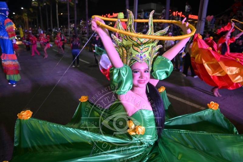 El desfile se desarrolló bajo la temática Países del Mundo y reunió expresiones artísticas de distintas regiones del estado y del extranjero. La Secretaría de Cultura de Veracruz (SECVER) participó con agrupaciones representativas como Combo Ninguno, el Ballet Quetzally, los tradicionales Toros de Almolonga, bandas de viento y la Comparsa de Saltabarranca, que desfiló con más de 200 integrantes. También se sumaron las Mojigangas de San Andrés Tuxtla, con cerca de 80 participantes, dentro del contingente denominado Por Amor a Veracruz.