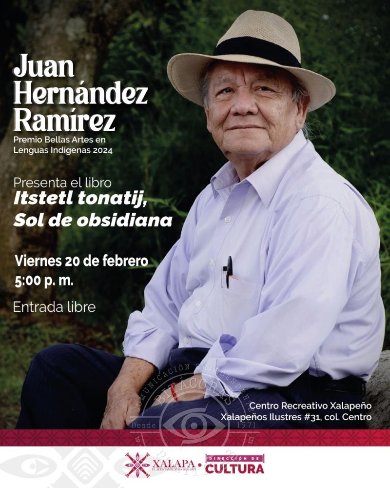 En el marco del Día Internacional de la Lengua Materna, el Ayuntamiento de Xalapa, a través de la Dirección de Cultura, anunció la presentación del poemario bilingüe Itstetl tonatij. Sol de obsidiana, del poeta en lengua náhuatl Juan Hernández Ramírez. El acto se realizará el viernes 20 de febrero, a las 17:00 horas, en el Centro Recreativo Xalapeño (CRX), ubicado en Xalapeños Ilustres número 31, en el Centro de la ciudad.