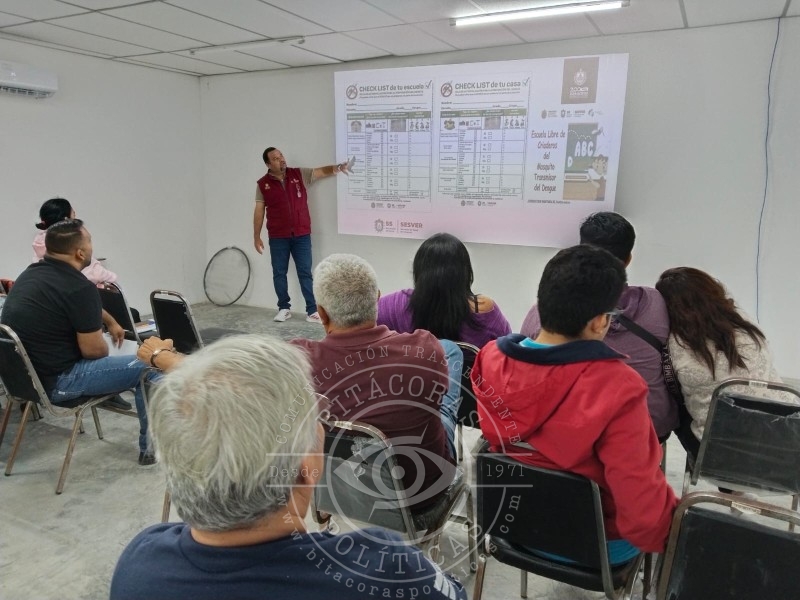 El responsable del Monitoreo de Determinantes de Dengue, Emmanuel Moreno Solares, impartió sesiones informativas dirigidas a docentes y madres y padres de familia. Subrayó que la prevención debe mantenerse todo el año, independientemente de la temporada de lluvias.