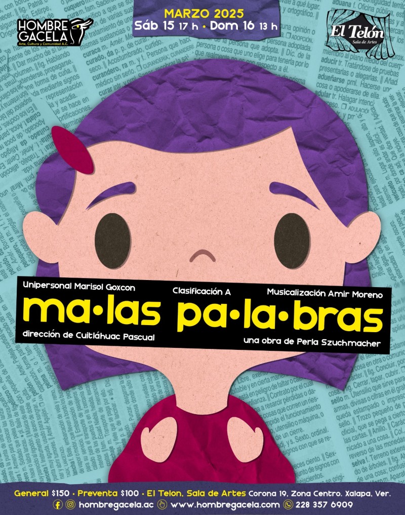 Por cuanto a la obra teatral “Malas Palabras”, se estrenará este 15 de marzo en El Telón Sala de Artes en Xalapa, con la actuación de Marisol Goxcon, música original de Amir Moreno y bajo la dirección de Cuitláhuac Pascual, con la fotografía de Mario Ocádiz y el diseño de cartel del Don Dusc.