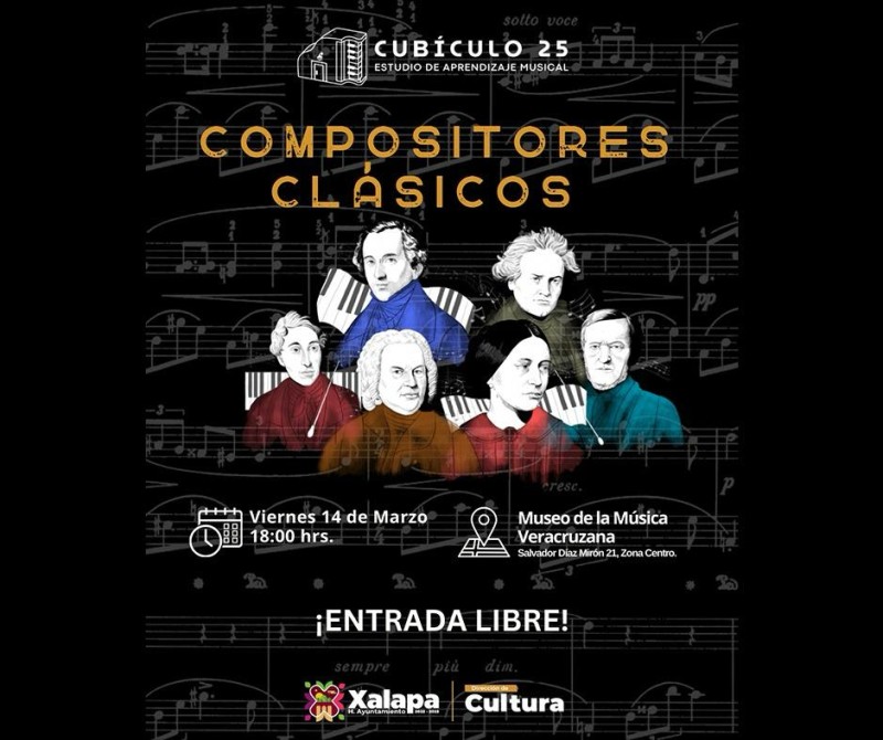 Xalapa, Ver. - El viernes 14 de marzo a las 18:00 horas, el Estudio de Aprendizaje Musical Cubículo 25 presentará el concierto “Compositores clásicos”, en el Museo de la Música Veracruzana. /
