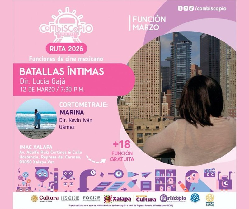 Xalapa, Ver. - El miércoles 12 de marzo a las 19:30 horas, en el auditorio de la IMAC, se llevará a cabo la proyección de “Batallas íntimas”, dirigida por Lucía Gajá, como parte del ciclo de cine mexicano del proyecto Combiscopio. /