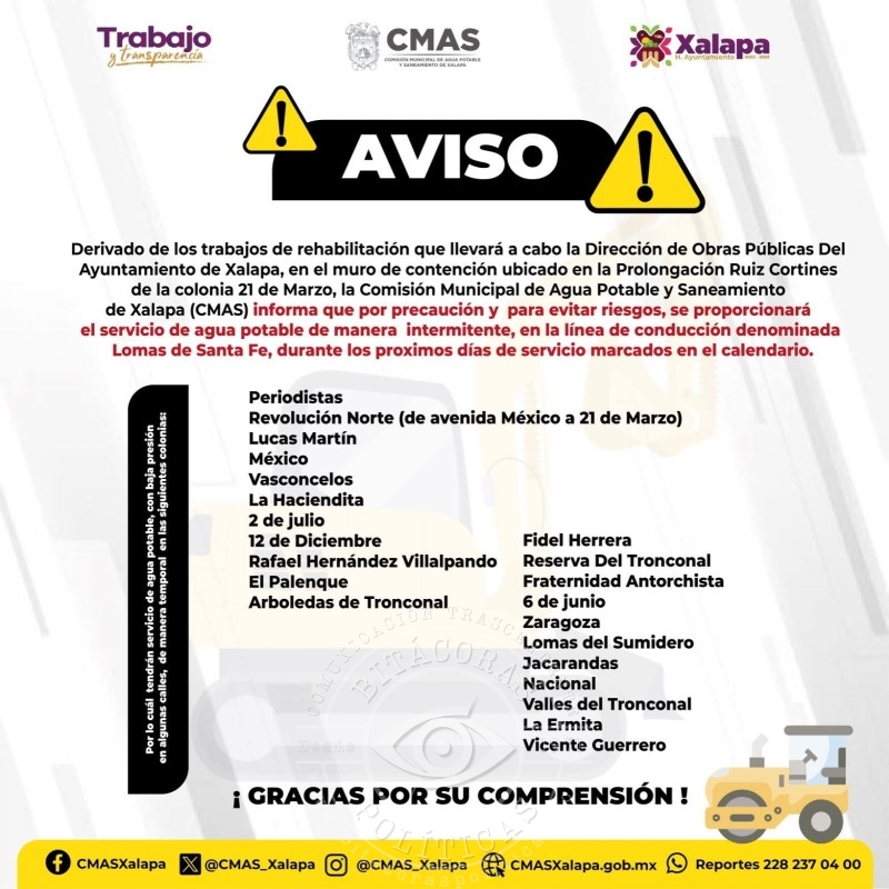 La CMAS informa que la interrupción se debe a trabajos de rehabilitación del muro de contención en Prolongación Ruiz Cortines; llaman a extremar medidas de uso racional del agua