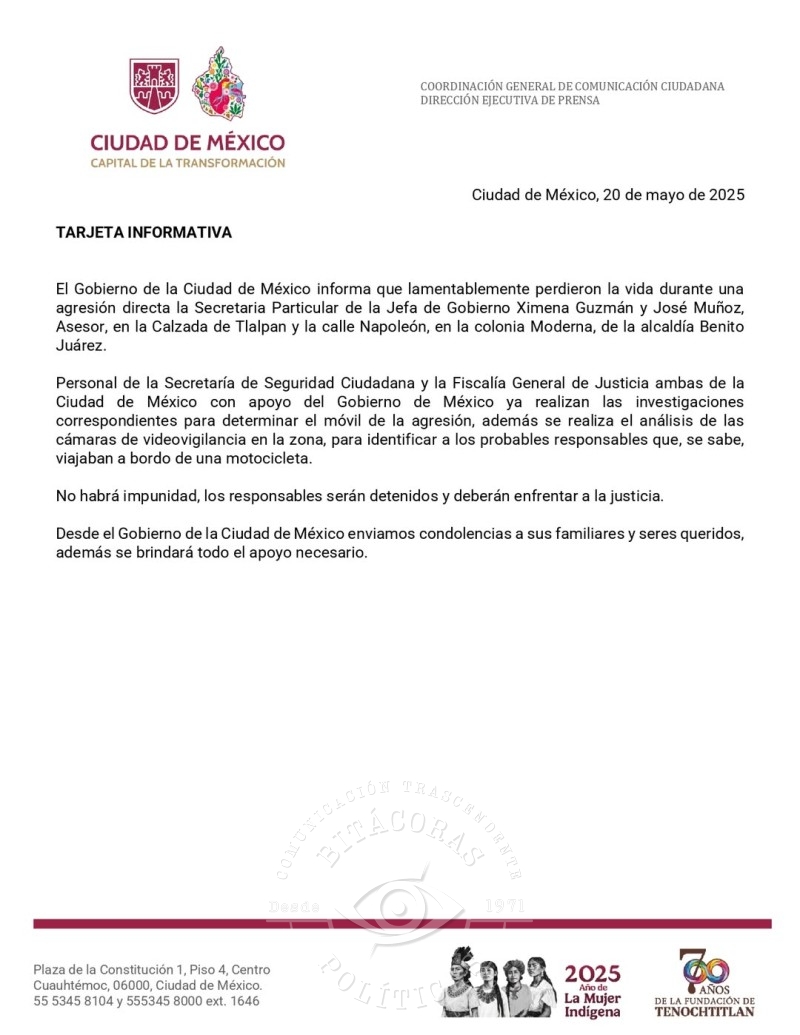 La jefa de Gobierno de la Ciudad de México y la presidenta Claudia Sheimbaun afirmaron que no habrá impunidad y que se intensificarán las investigaciones para dar con los responsables.