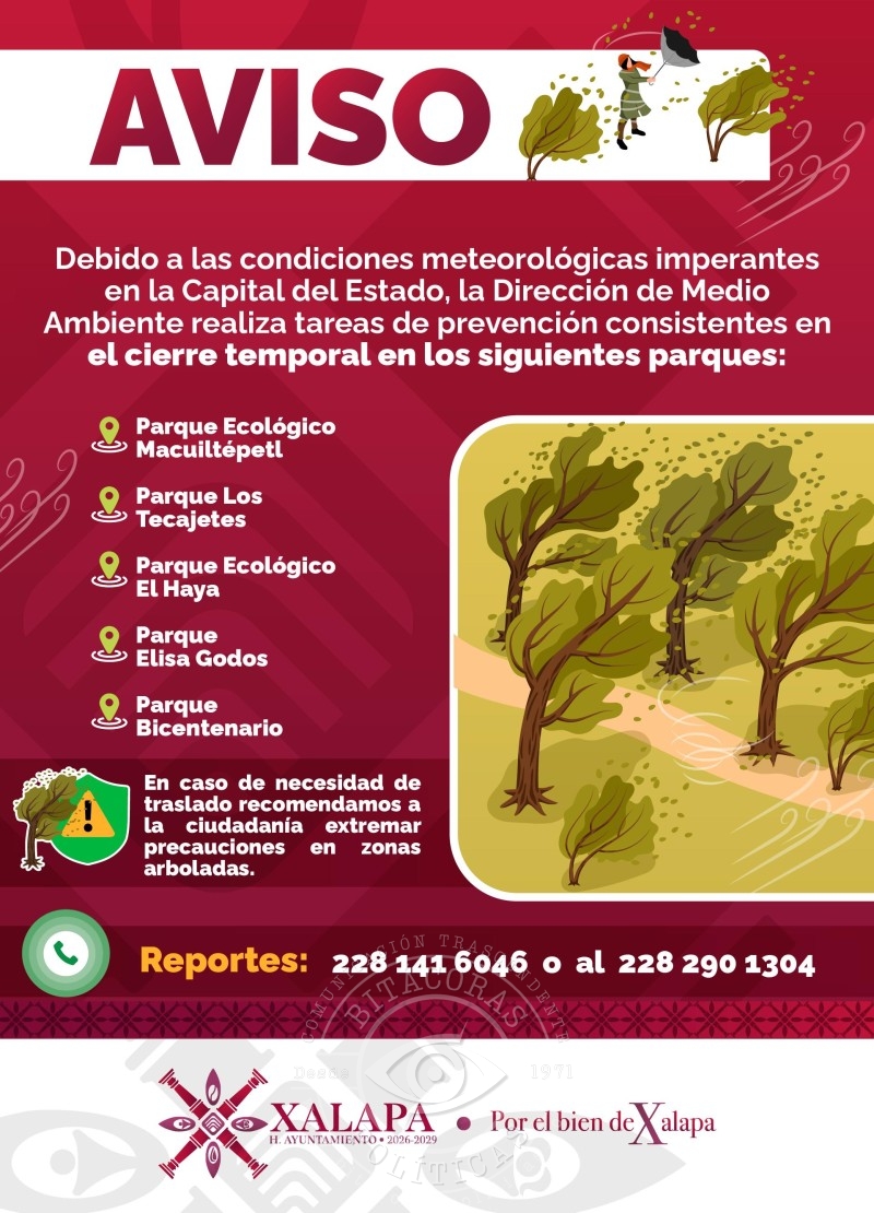 El Ayuntamiento ordenó el cierre temporal de cinco espacios públicos como medida preventiva para proteger a la población, ante rachas de viento y clima inestable en la capital veracruzana.