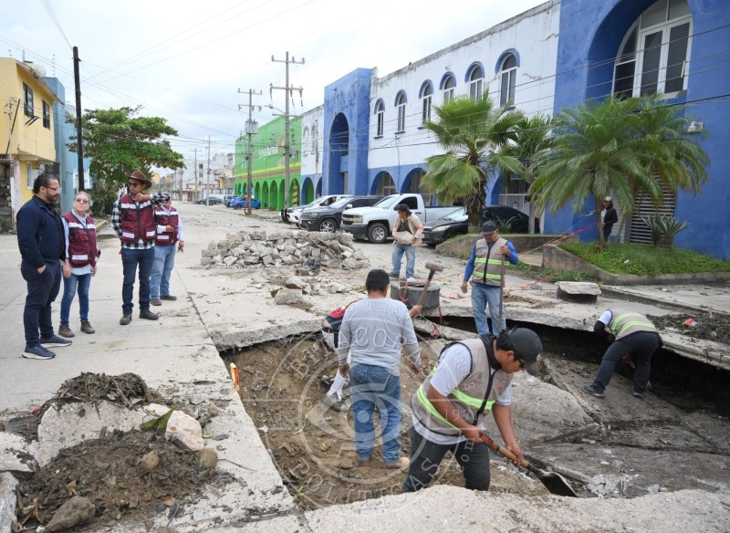 El alcalde de Coatzacoalcos supervisó obras de drenaje y vialidades dañadas por colapsos sanitarios, un problema arrastrado por años en la colonia Playa Sol.