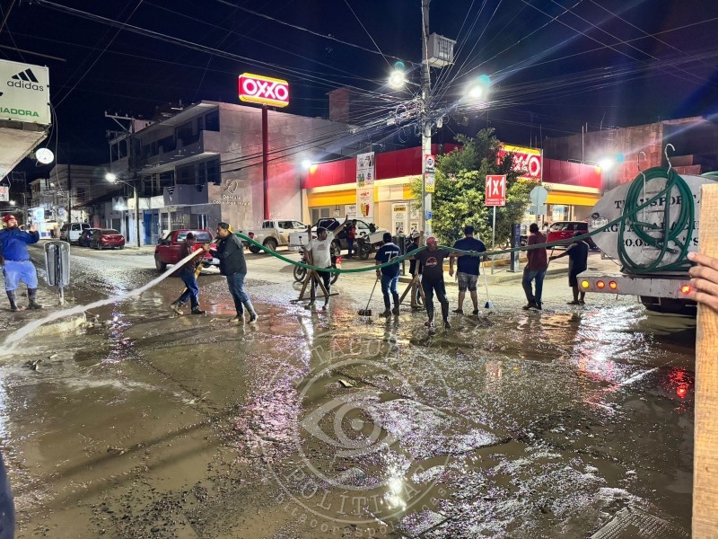 Personal del Ayuntamiento, comerciantes y vecinos se suman a las labores de limpieza y saneamiento tras las inundaciones; el alcalde Jesús Fomperoza Torres anuncia que los trabajos continuarán sin descanso hasta recuperar la normalidad.