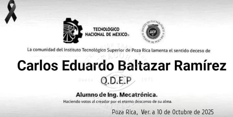 Carlos Eduardo Baltazar Ramírez, alumno de Ingeniería Mecatrónica y miembro del Club de Robótica, pierde la vida en el desastre que afectó a la ciudad.