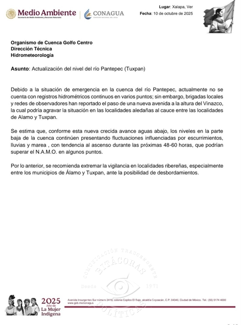 La Comisión Nacional del Agua (CONAGUA) advierte posibles desbordamientos en localidades ribereñas entre Álamo y Tuxpan; se recomienda extremar precauciones y acudir a albergues temporales.