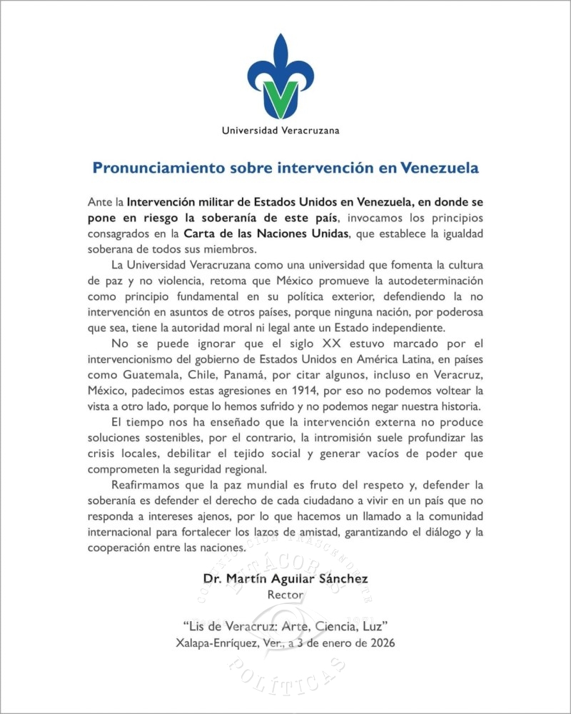 La Universidad Veracruzana se pronunció en favor de la paz, la autodeterminación de los pueblos y la no intervención, en sintonía con la UNAM y otras casas de estudio.
