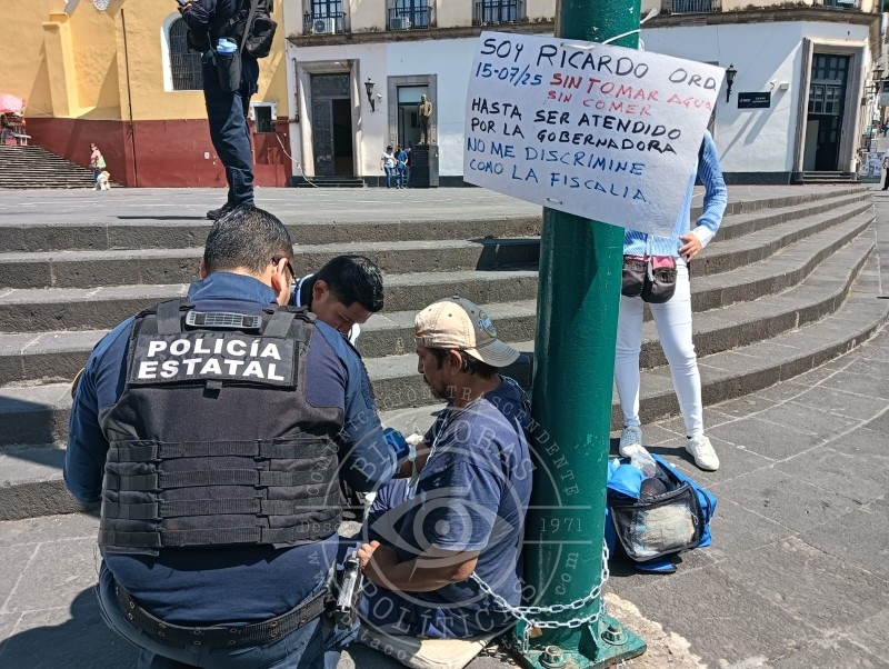 Juan Ricardo Ordóñez, encadenado por segundo día consecutivo en la Plaza Lerdo, fue atendido por paramédicos tras sufrir deshidratación; acusa omisión de la FGE en caso de despojo y amenazas