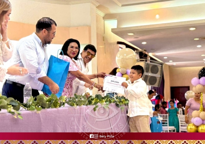 La síndica Bety Piña, el alcalde Jesús Fomperoza y la presidenta del DIF, Melba López, participaron en la ceremonia de fin de cursos del Centro de Atención Infantil Comunitario, reconociendo el esfuerzo de niñas, niños, educadoras y familias.
