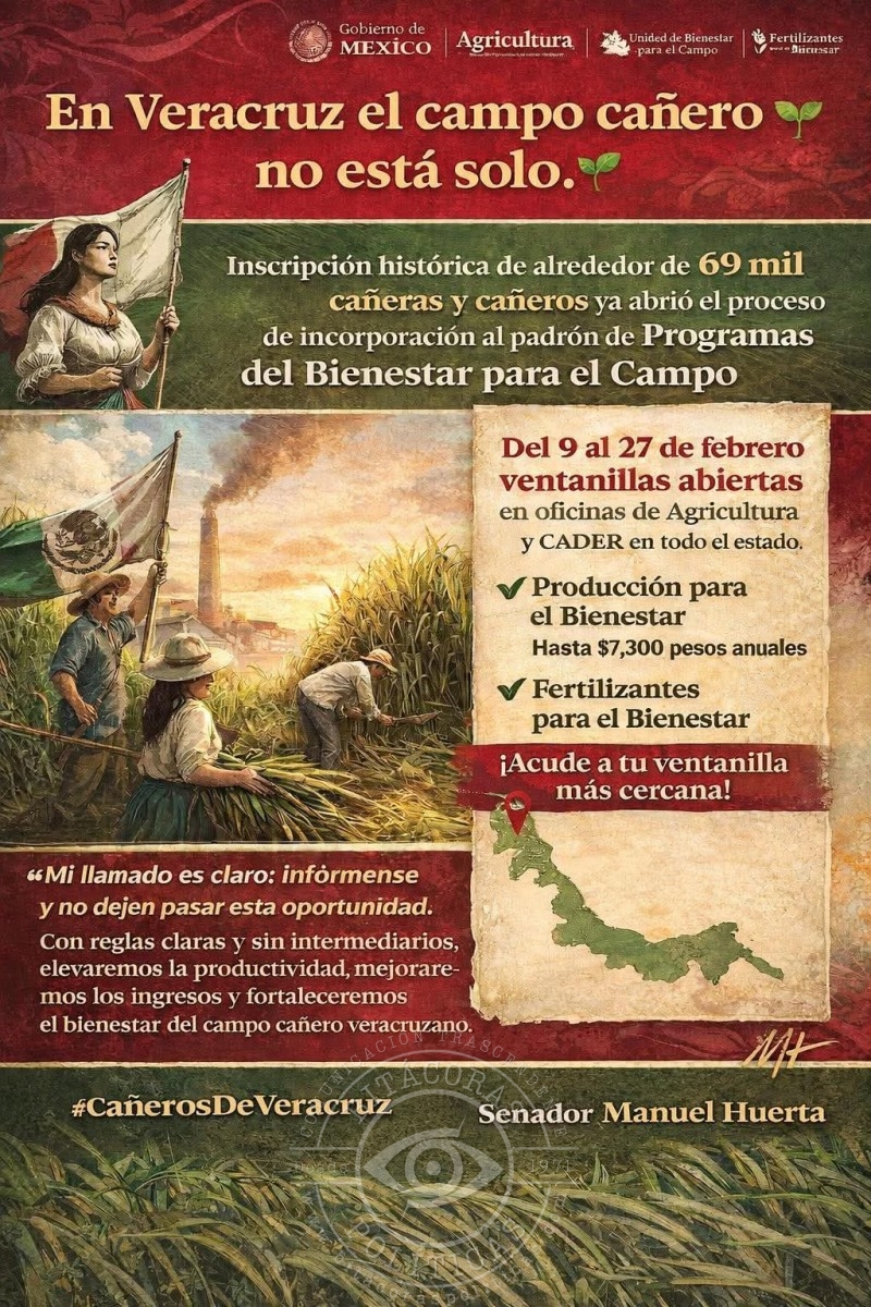 Del 9 al 27 de febrero se abrirán ventanillas para incorporar a cañeras y cañeros a los programas Producción para el Bienestar y Fertilizantes para el Bienestar, como parte de la estrategia federal de fortalecimiento del campo.
