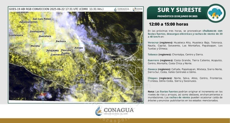 La Comisión Nacional del Agua alertó sobre tormentas eléctricas y ráfagas de viento de hasta 40 km/h en las próximas tres horas; se recomienda evitar zonas de riesgo y seguir medidas preventivas
