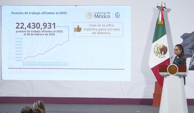 De los trabajos afiliados al IMSS 19 millones 461 mil empleos son permanentes, lo que representa el 86.8 por ciento Las mujeres ocupan 9 millones 37 mil 569 de los puestos de trabajo, lo que representa el 40 por ciento. En febrero 2025 se crearon 119 mil 385 nuevos puestos, mientras que en lo que va del año se han creado 192 mil 552 nuevos empleos. El salario base de cotización de las y los trabajadores es 619.6 pesos diarios, el salario base más alto del que se tenga registro. Al 28 de febrero 303 mil 371 trabajadores independientes se afiliaron de manera voluntaria al IMSS.