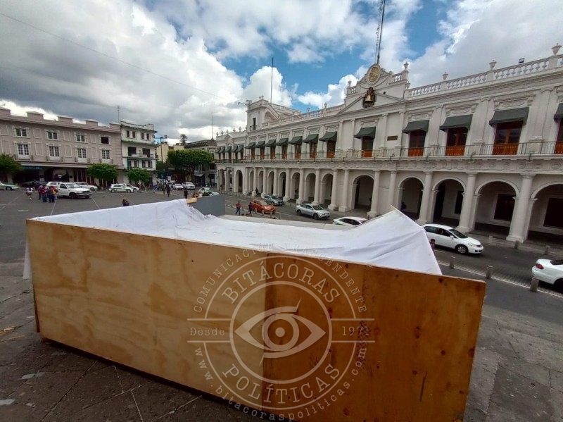 Personal de Servicios Generales instala el escenario para el acto oficial del 30 de noviembre en el centro de Xalapa.